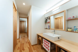 オプションで断熱材を追加するのではなく、最初から高い性能が「標準仕様」として備わっている会社を選ぶことをおすすめします。私たちも、家じゅうをほぼ一定の温度と湿度に保つ全館空調システム「AirE(エアーイー)」と高気密高断熱仕様で断熱性能等級6を標準としています。玄関や脱衣所まで温度差の少ない、やわらかな暖かさに包まれる暮らしは、からだへの負担も少なく、健康的な毎日をサポートしてくれます。