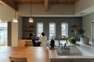 完全に壁で仕切って小さな部屋をたくさん作るのではなく、「空間はつながっているけれど、視線が交わらない場所」を作ることがポイントです。例えば、リビングの一角に本棚でゆるやかに仕切った書斎コーナーを設けたり、L字型のLDKにしてお互いの気配を感じつつも別々の作業ができるようにしたりと、少ない間仕切りでも一人ひとりの居場所を作る設計をおすすめします。