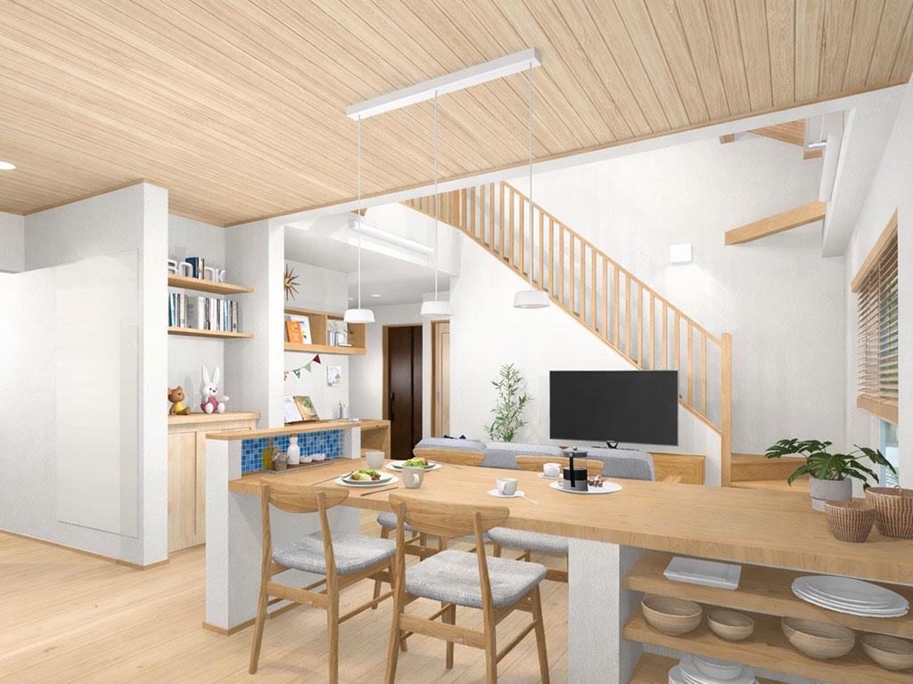 リビングの大きな吹き抜けや行き止まりのない回遊動線が魅力的な1.5階建て。造作で仕上げた存在感のあるダイニングカウンター、洗濯がスムーズに行える家事ラク動線や広々としたファミリークローク、小屋裏と半地下の大容量収納など、快適な暮らしを叶えるこだわりが見られます。無垢材のやさしい温もりと、GX志向型住宅で断熱性に優れた温熱環境をぜひご体感ください。