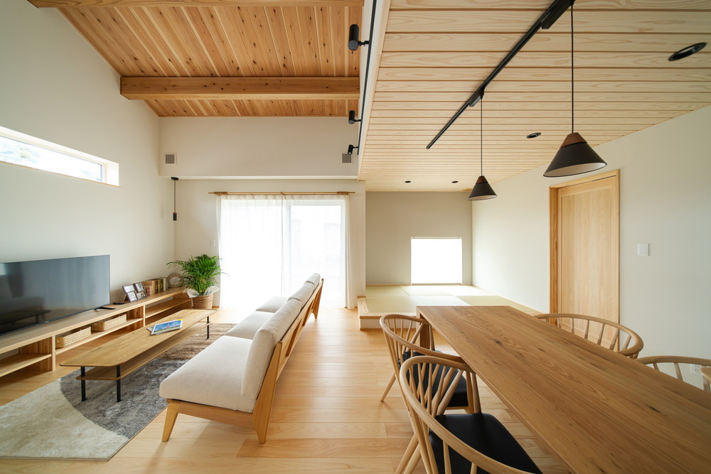 ① 勾配天井で光と風が心地よくめぐるリビングダイニング